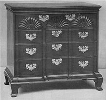 The furniture associated with the Goddard and Townsend families is identified by a number of unique features. The so-called Block-and-shell motif, a block-front topped by a carved shell in alternating concave and convex pattern, is one of the key features. However, this alone is not proof of Goddard or Townsend origin- recently rediscovered cabinetmakers such as Benjamin Baker (1734–1822) of Newport or Grindal Rawson (1719–1803) of Providence are also known to have used the carved shell pattern when constructing case furniture.[3] Newport furniture of this school is also associated with a distinct ball and claw foot, in which there is an open space carved between the talon and ball. Such a form is thought to be unique to Newport, though not unique to the Goddard or Townsend families.