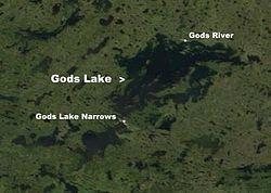 God's Lake Narrows is a community located in northeastern Manitoba in Canada. The community is located on the shores of Gods Lake, which is the 7th largest lake in the province. God's Lake has a maximum depth of 75 meters.