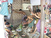 The gold is taken out of the shoder and placed on a leather-covered surface. The gold is thin enough now that the cutter can simply blow on it to flatten it out. Using a wooden implement called a wagon, the gold is quickly cut into four pieces and immediately placed in a packet called a mold for the final beating.[1] The wagon has sharp cutting blades, traditionally made from malacca cane (rattan). The mold contains 1,500 pieces of gold. Before the mold is filled with gold, the skins are coated with a gypsum powder. This process prevents the delicate gold leaf from sticking to the skins.[3] The mold is beaten with an 8-pound (3.6 kg) hammer for three to four hours until it has been beaten into a circle about six inches (15 cm) in diameter. The finished leaf forms an unbroken sheet of gold with a thickness of approximately 100 nanometres (1&fras1;250000 in). After the leaves are taken out of the mold, they are conventionally cut into a three-and-three-eighths-inch (8.6 cm) square and packaged in tissue-paper books containing twenty-five leaves.
