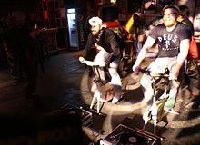 A Goldsprint is a bicycle rollers racing and social event. Riders on stationary bikes compete against each other in front of spectators.