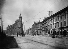 The Gooderham Building, also known as the Flatiron Building, is an historic office building at 49 Wellington Street East in Toronto, Ontario, Canada. It is located on the eastern edge of the city's Financial District (east of Yonge Street) in the St. Lawrence neighbourhood, wedged between Front Street and Wellington Street in Downtown Toronto, where they join up to form a triangular intersection. Completed in 1892, the red-brick edifice was an early example of a prominent flatiron building.