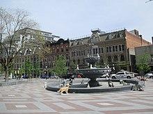 Berczy Park is a small park located behind the Gooderham Building at Front Street and Wellington Street in Toronto. In the late 19th century and early 20th century, commercial buildings occupied the area (Pacific Building at 34 Front, Stern's Building at 40-42 Front, Janus Building at 50 Front), but it became a vacant lot and parking lot by the 1980s. Thereafter, a tree-lined city park was added and renovations, completed in 2017, added a large three-tier fountain designed by Montreal landscape architect Claude Cormier. The fountain features 27 cast-iron dogs spouting water, a cast-iron cat, and a bone crowning the fountain.[4] The fountain, which features a trough for dogs to drink from, became a popular destination, particularly for dog lovers.[5]