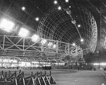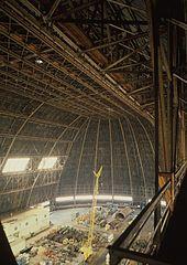 In 1929, Goodyear Zeppelin Corporation, later Goodyear Aerospace, sought a structure in which "lighter-than-air" ships (later known as airships, dirigibles, and blimps) could be constructed.[5] The company commissioned Karl Arnstein of Akron, Ohio, whose design was inspired by the blueprints of the first aerodynamic-shaped airship hangar, built in 1913 in Dresden, Germany.[6]