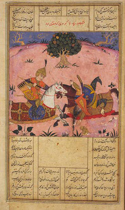 But one of those within the fortress was a woman, daughter of the warrior Gazhdaham, named Gordafarid. When she learned that their leader had allowed himself to be taken, she found his behaviour so shameful that her rosy cheeks became as black as pitch with rage. With not a moment's delay she dressed herself in a knight's armour, gathered her hair beneath a Rumi helmet, and rode out from the fortress, a lion eager for battle. She roared at the enemy ranks, "Where are your heroes, your warriors, your tried and tested chieftains?"