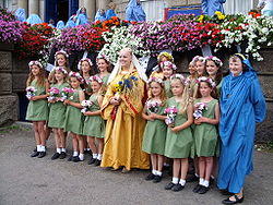 The Gorsedh Kernow (Gorsedd of Cornwall) was set up in 1928 at Boscawen-Un by Henry Jenner, one of the early proponents of Cornish language revival, who took the bardic name "Gwas Myghal", meaning "servant of Michael". He and twelve others (including Kitty Lee Jenner) were initiated by the Archdruid of Wales. It has been held every year since, except during World War II. 1,000 people have been Cornish bards, including Dame Alida Brittain, Ken George, R. Morton Nance, and Peter Berresford Ellis.[1][2]