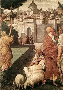 Mary is presented as an extraordinary child destined for great things from the moment of her conception.[1] The wealthy Joachim and his wife Anna (or Anne) are distressed that they have no children, and Joachim goes into the wilderness to pray, while Anna laments her childless state and prays also.[2] God hears Anna's prayer, angels announce the coming child, and in the seventh month of Anna's pregnancy (underlining the exceptional nature of Mary's future life) she is born.[19][2] Anna dedicates the child to God and vows that it shall be raised in the Temple.[2] Joachim and Anna name the child Mary, and when she is three years old they send her to the Temple,[2] where she is fed each day by an angel.[18]