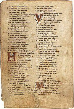 The first section (ll. 1-44) of the prologue is written in quatrains and is referred to as the "strophic prologue", while pairs of quatrains, of sententious content, mark the main divisions of the story. The initial letters of the quatrains, indicated by large initials in some manuscripts, form an acrostic with the names Gotefrid-Tristan-Isolde, which runs throughout the poem. In addition, the initial letters of the quatrains in the prologue give the name Dieterich, which is assumed to have been the name of Gottfried's patron.
