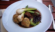 In Czechia and Slovakia, goulash (Czech and Slovak: guláš) is usually made with beef, although pork varieties exist, and served with boiled or steamed bread dumplings (goulash with beef in Czech hovězí guláš s knedlíkem, in Slovak hovädzí guláš s knedľou), in Slovakia more typically with bread. In pubs it is often garnished with slices of fresh onion, and is typically accompanied by beer. Beer can be also added to the stew in the process of cooking. Seasonal varieties of goulash include venison or wild boar goulashes. Another popular variant of guláš is segedínský guláš (Székelygulyás), with sauerkraut.
