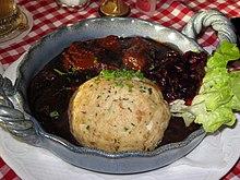 German Gulasch is either a beef (Rindergulasch), pork (Schweinegulasch), venison (Hirschgulasch), or wild boar (Wildschweingulasch)[18] stew that may include red wine and is usually served with potatoes (in the north), white rice or spirelli noodles (mostly in canteens), and dumplings (in the south). Gulaschsuppe (goulash soup) is the same concept served as a soup, usually with pieces of white bread.