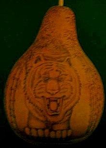 Gourd art involves creating works of art using Lagenaria spp. hard-shell gourds as an art medium. Gourd surfaces may be carved, painted, sanded, burned, dyed, and polished. Typically, a harvested gourd is left to dry over a period of months before the woody surface is suitable for decorating.[1]