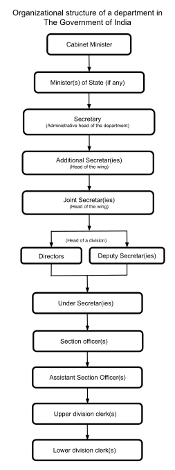 A secretary to the Government of India, a civil servant, generally an Indian Administrative Service (IAS) officer,[19][20][21][22] is the administrative head of the ministry or department, and is the principal adviser to the minister on all matters of policy and administration within the ministry/department.[23][24] Secretaries to the Government of India rank 23rd on Indian order of precedence.[25][26][27][28] Secretaries at the higher level are assisted by one or many additional secretaries, who are further assisted by joint secretaries.[24] At the middle they are assisted by directors/deputy secretaries and under secretaries.[24] At the lower level, there are section officers, assistant section officers, upper division clerks, lower division clerks and other secretarial staff.[24]