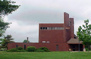 Architecturally, the postmodern brick structure is minimalist in its design. It is reminiscent of the exterior simplicity of the Rothko Chapel in Houston built only a few years earlier, while its twin steeple foreshadows the deconstructivism style in architecture that began a decade later. The chapel houses Aaron Sherer's "The Process of Becoming," a canvas wall hanging employing a mix of colorfully painted ribbons.