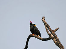 The common hill myna (Gracula religiosa), sometimes spelled "mynah" and formerly simply known as the hill myna or myna bird, is the myna most commonly seen in aviculture, where it is often simply referred to by the latter two names. It is a member of the starling family (Sturnidae), resident in hill regions of South Asia and Southeast Asia. The Sri Lanka hill myna, a former subspecies of G. religiosa, is now generally accepted as a separate species G. ptilogenys. The Enggano hill myna (G. enganensis) and Nias hill myna (G. robusta) are also widely accepted as specifically distinct, and many authors favor treating the southern hill myna (G. indica) from the Nilgiris and elsewhere in the Western Ghats of India as a separate species.