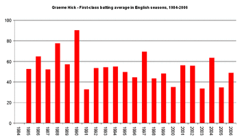 Hick's personal form during his captaincy was generally good, although his overall statistics in 2000 – the first time he had failed to reach 1,000 runs since 1984 – were depressed by his England travails; in the County Championship alone in those three summers he averaged 43.41, 60.43 and 52.58, and by making 200* at Durham he completed the set of having made first-class hundreds against all 17 other counties, both home and away. In one-day games the picture was somewhat more mixed, though in June 2001 he did make 155, his highest List A score for 14 years, against Hertfordshire in the C&G Trophy.