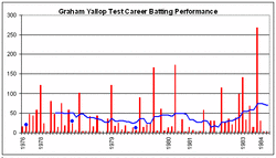 Yallop had averaged 44 for three tests. He ended the summer with scores of 24 and 7 against NSW,[34] and 77 and 13 against South Australia.[35] He made 524 runs for Victoria at an average of 47.63, their best performing batsman.