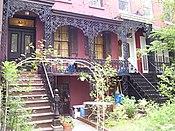 At No. 34 and No. 36 Gramercy Park (East) are two of New York's first apartment buildings, designed in 1883 and 1905.[33] In addition, No. 34 is the oldest existing co-operative apartment building in the city.[34] Elsewhere in the neighborhood, nineteenth century brownstones and carriage houses abound, though the 1920s brought the onset of tenant apartments and skyscrapers to the area.