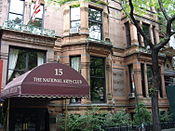 In the center of the park is a statue of one of the area's most famous residents, Edwin Booth, which was dedicated on November 13, 1918.[39][40][41] Booth was one of the great Shakespearean actors of 19th Century America, as well as the brother of John Wilkes Booth, the assassin of Abraham Lincoln. The mansion at No. 16 Gramercy Park (South) was purchased by Booth and renovated by Stanford White at his request to be the home of the Players' Club, which Booth founded. He turned over the deed to the building on New Year's Eve 1888.[33][40] Next door at No. 15 Gramercy Park (South) is the National Arts Club, established in 1884 in a Victorian Gothic mansion which was originally home to the New York Governor and 1876 Presidential Candidate, Samuel J. Tilden. Tilden had steel doors and an escape tunnel to East 19th Street to protect himself from the sometimes violent politics of the day.[33]