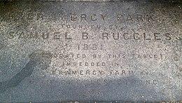 The area which is now Gramercy Park was once in the middle of a swamp. In 1831 Samuel B. Ruggles, a developer and advocate of open space, proposed the idea for the park due to the northward growth of Manhattan. He bought the property,[5] 22 acres of what was then a farm called "Gramercy Farm", from the heirs of James Duane, son of the former mayor, father of James Chatham Duane, and a descendant of Peter Stuyvesant. Ruggles then deeded the land on December 17, 1832 to five trustees, who pledge to hold 42 lots in trust to be used as parkland.[26] To develop the property, Ruggles spent $180,000 to landscape it, draining the swamp and causing about a million horsecart loads of earth to be moved.[18][20] He then laid out "Gramercy Square", deeding possession of the square to the owners of the 66 parcels of land he had plotted to surround it, and sought tax-exempt status for the park, which the city's Board of Aldermen granted in 1832. It was the second private square created in the city, after Hudson Square, also known as St. John's Park, which was laid out by the parish of Trinity Church.[8] Numbering of the lots began at No. 1 on the northwest corner, on Gramercy Park West, and continued counter-clockwise: south down Gramercy Park West, then west to east along Gramercy Park South (East 20th Street), north up Gramercy Park East, and finally east to west along Gramercy Park North (East 21st Street).[8]