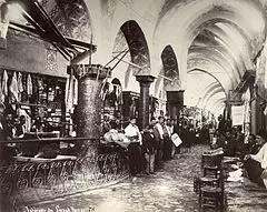 Until the restoration following the quake of 1894, the Grand Bazaar had no shops as found in the western world: along both sides of the roads merchants sat on wooden divans in front of their shelves.[25] Each of them occupied a space 6 to 8 feet (1.8 to 2.4 m) in width, and 3 to 4 feet (0.91 to 1.22 m) in depth. This was named in Turkish dolap, meaning 'stall'.[25] The most precious merchandise was not on display, but kept in cabinets.[25] Only clothes were hung in long rows, with a picturesque effect. A prospective client could sit in front of the dealer, talk with him and drink a tea or a Turkish coffee, in a relaxed way.[25] At the end of the day, each stall was closed with drapes. Another peculiarity was the complete lack of advertising.[26] Moreover, as everywhere in the East, traders of the same type of goods were forcibly concentrated along one road, which got its name from their profession.[27] The Inner Bedesten hosted the most precious wares: jewelers, armourers, crystal dealers had their shops there.[27] The Sandal Bedesten was mainly the center of the silk trade, but also other goods were on sale there.[15] The most picturesque parts of the market were – apart from the two Bedestens – the shoe market (Turkish: Pabuççular Pazarı), where thousands of shoes of different colors (Ottoman sumptuary laws prescribed yellow shoes for Muslims, blue for Greek Orthodox, black for Jews and red for Armenians) were on display on high shelves;[28] the spice and herbs market (later concentrated in the Egyptian Bazaar), which stood near the jewelers; the armour and weapon market; the old book market; and the flea market.[29]
