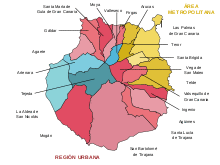The island of Gran Canaria is governed by the Cabildo insular de Gran Canaria.[13] Gran Canaria Island itself is divided into twenty-one smaller municipalities:[12]