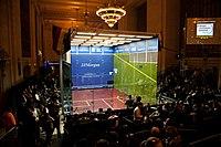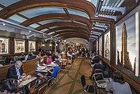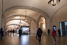 The Oyster Bar ramps lead down from the Main Concourse to the Oyster Bar and Dining Concourse.[33] They span a total of 302 ft (92 m) from east to west under an 84 ft (26 m) ceiling.[50] The ramps were partially covered by expanded main-floor ticket offices from 1927 until the terminal's restoration in 1998. A pedestrian overpass spans over the ramps, leading from Vanderbilt Hall to the Main Concourse. The bridge has been visible since 1998, restoring the original appearance with one minor change – the bridge now has a low balustrade, replacing an eight-foot-high solid wall that blocked views between the two levels.[49] The underside of the bridge is covered with Guastavino tiling.[51] The bridge's arches creates a whispering gallery: a person standing in one corner can hear another speaking softly in the diagonally opposite corner.[52][53]