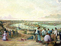 In July 1759, Miꞌkmaq and Acadians killed five British in Dartmouth, opposite McNabb's Island.[54] By June 1757, the settlers had to be completely withdrawn from Lawrencetown (established 1754) because the number of Indian raids prevented settlers from leaving their houses.[69] In nearby Dartmouth, in the spring of 1759, another Miꞌkmaw attack was launched on Fort Clarence, located at the present-day Dartmouth Refinery, in which five soldiers were killed.[70] Before the deportation, the Acadian population was estimated at 14,000. Most were deported,[71] but some Acadians escaped to Quebec, or hid among the Miꞌkmaq or in the countryside, to avoid deportation until the situation settled down.[72]