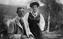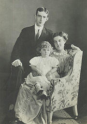 After a honeymoon in Germany, Italy and France, the newlyweds went to Sweden, where an official ceremonial reception awaited them with the state flags of Russia and Sweden waving in Stockholm.[3] In the beginning, the marriage looked successful. The couple set up their home in the Swedish countryside in the province of Södermanland.[19] They spent the summer there, returning in October to Stockholm.[19] Maria added Swedish to the other five languages she spoke, and became popular in her new country. The Swedes felt she worked harder than her husband did. She was well liked by her father-in-law Gustaf V, who appreciated her "effervescence, charm, and unconventionality."[20] Maria Pavlovna, known in Sweden as the Duchess of Södermanland, was pregnant by the fall, but she quickly realized that she had little in common with her husband. Their relationship was cold. She had little interest in him and he in her. The couple's only child was born on 8 May 1909.[21] He was Prince Lennart, Duke of Småland, later Count of Wisborg (1909–2004)