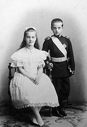 Maria Pavlovna childhood was spent in splendor. Her early memories were of magnificent palaces and lazy country estates populated by armies of servants. Until she was six, Maria spoke Russian badly as all of her governesses and the immediate family spoke English.[3] Later she had another governess, Mademoiselle Hélène who taught her French and stayed with her until her marriage. At the age of seven she traveled in her own personal railway car accompanied by her governess to visit Germany and France. On Sundays, she and her brother were allowed to play with children from aristocratic families.[3] Growing up without a mother and with a frequently absent father, Grand Duchess Maria and her brother Dimitri became very close, relying on each other for affection and companionship.[7]