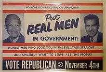 The second half of the 20th century saw the election or succession of Republican presidents Dwight D. Eisenhower, Richard Nixon, Gerald Ford, Ronald Reagan and George H. W. Bush. Eisenhower had defeated conservative leader Senator Robert A. Taft for the 1952 nomination, but conservatives dominated the domestic policies of the Eisenhower administration. Voters liked Eisenhower much more than they liked the GOP and he proved unable to shift the party to a more moderate position. Since 1976, liberalism has virtually faded out of the Republican Party, apart from a few Northeastern holdouts.[47] Historians cite the 1964 United States presidential election and its respective 1964 Republican National Convention as a significant shift, which saw the conservative wing, helmed by Senator Barry Goldwater of Arizona, battle the liberal New York Governor Nelson Rockefeller and his eponymous Rockefeller Republican faction for the party presidential nomination. With Goldwater poised to win, Rockefeller, urged to mobilize his liberal faction, relented, "You’re looking at it, buddy. I’m all that’s left."[48][49] Though Goldwater lost in a landslide, Reagan would make himself known as a prominent supporter of his throughout the campaign, delivering the "A Time for Choosing" speech for him. He'd go on to become governor of California two years later, and in 1980, win the presidency.[50]
