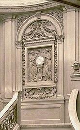 The ornamented oak panel comprised a half-point arch supported by two pilasters in composite order, each capital decorated with a winged putti's head in its centre. As a curiosity, the four volutes, two for each capital, were carved reversed. In the central panel, the round case of the clock itself rested upon an estipite adorned with laurel festoons, this was flanked by two winged female figures in mid-relief dressed with a chiton. From the onlooker's point of view, the figure at left represented Honour whereas the one at right depicted Glory. As accompanying attributes, Honour held a tablet in her left hand while the other was writing using a stylus, her left foot rested on top of a terrestrial globe. The personification of Glory had a palm branch in her right hand and next to her right foot was seen a laurel wreath in a vertical position leant against the aforesaid estipite. Surrounding the figural central panel there were different decorative motifs such as swags of fruits and flowers, egg-and-dart, scrolls, acanthus, rosettes, a pair of seated griffins, etc.