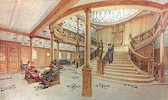 The D-Deck staircase opened directly onto the Reception Room and adjoining Dining Saloon. Behind the staircase were two arched entry vestibules and the companionways which communicated with First-Class staterooms in the forward part of the ship.