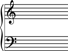 A vertical line drawn to the left of multiple staves creates a system, indicating that the music on all the staves is to be played simultaneously. A bracket is an additional vertical line joining staves to show groupings of instruments that function as a unit, such as the string section of an orchestra. A brace is used to join multiple staves that represent an instrument, such as a piano, organ, harp, or marimba.[3] Sometimes a second bracket is used to show instruments grouped in pairs, such as the first and second oboes or first and second violins in an orchestra.[4] In some cases, a brace is used for this purpose.[3][5]