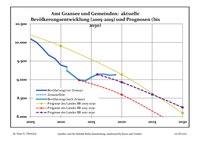 Recent Population Development and Projections (Population Development before Census 2011 (blue line); Recent Population Development according to the Census in Germany in 2011 (blue bordered line); Official projections for 2005-2030 (yellow line); for 2014-2030 (red line); for 2017-2030 (scarlet line)
