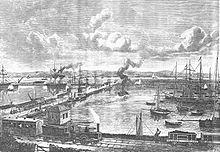 Construction began in June 1837 and the initial central pier was opened on 28 June 1838, coinciding with the coronation of Queen Victoria. The entire project was funded by the 5th Duke of Buccleuch. The original project included a central pier named the Victoria Jetty and a road running eastwards to Leith. The young Queen Victoria landed at the pier on RY Royal George on 1 September 1842 on her first official visit to Edinburgh as queen. In 1843/44 the pier was extended in length to a total of 1700 feet (around 500m) this stage being completed in October 1844.[3] By 1845 an "exceedingly low" cost steamboat service used to run between Stirling and Granton.[4]