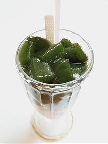 Plain grass jelly is mixed in various kinds of desserts, such as ais kacang and cendol. It is also mixed with cold soy milk and served as a refreshing drink/dessert, a drink known as Michael Jackson in South-East Asia (a reference to Michael Jackson's changing skin color and/or the song "Black or White").[9] Various combinations of grass jelly with rose flavoured syrup added to milk (bandung) are called "bandung cincau" or "bancau" for short. There is also shaved ice with grass jelly toppings. It can be green or brown.