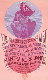 One of the group's earliest major performances in 1967 was the Mantra-Rock Dance—a musical event held on January 29, 1967, at the Avalon Ballroom by the San Francisco Hare Krishna temple. The Grateful Dead performed at the event along with the Hare Krishna founder Bhaktivedanta Swami, poet Allen Ginsberg, bands Moby Grape and Big Brother and the Holding Company with Janis Joplin, donating proceeds to the Krishna temple.[37][38] The band's first LP, The Grateful Dead, was released on Warner Brothers in 1967.