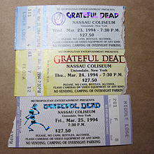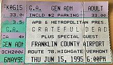 In the 1990s, the Grateful Dead earned a total of $285 million in revenue from their concert tours, the second-highest during the 1990s, with the Rolling Stones earning the most.[119] This figure is representative of tour revenue through 1995, as touring stopped after the death of Jerry Garcia.[119] In a 1991 PBS documentary, segment host Buck Henry attended an August 1991 concert at Shoreline Amphitheatre and gleaned some information from some band members about the Grateful Dead phenomenon and its success.[120] At the time, Jerry Garcia stated, "We didn't really invent the Grateful Dead, the crowd invented the Grateful Dead, you know what I mean? We were sort of standing in line, and uh, it's gone way past our expectations, way past, so it's, we've been going along with it to see what it's gonna do next."[120] Furthermore, Mickey Hart stated, "This is one of the last places in America that you can really have this kind of fun, you know, considering the political climate and so forth."[120] Hart also stated that "the transformative power of the Grateful Dead is really the essence of it; it's what it can do to your consciousness. We're more into transportation than we are into music, per se, I mean, the business of the Grateful Dead is transportation."[120] One of the band's largest concerts took place just months before Garcia's death — at their outdoor show with Bob Dylan in Highgate, Vermont on June 15, 1995. The crowd was estimated to be over 90,000; overnight camping was allowed and about a third of the audience got in without having purchased a ticket.[121][122][123]