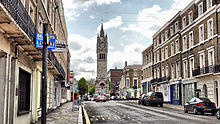 Situated at the junction of Milton Road and Harmer Street, its foundation stone was laid on 6 September 1887. The memorial stone records that the clock tower was erected by public subscription (£700 was raised toward its construction) and dedicated to Queen Victoria, to commemorate the 50th year of her reign.[45] Built of Portland and Dumfries stone and backed by London stock brick, the design of the structure is based on the design of the Elizabeth Tower in the Palace of Westminster, which houses Big Ben. The centre of the clock itself is measured at 50 feet (15 m) above ground and the face measures 5 ft 6 in (1.68 m) in diameter. The tower is Grade II listed.[46]