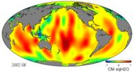 GRACE chiefly detected changes in the distribution of water across the planet. Scientists use GRACE data to estimate ocean bottom pressure (the combined weight of the ocean waters and atmosphere), which is as important to oceanographers as atmospheric pressure is to meteorologists.[15] For example, measuring ocean pressure gradients allows scientists to estimate monthly changes in deep ocean currents.[16] The limited resolution of GRACE is acceptable in this research because large ocean currents can also be estimated and verified by an ocean buoy network.[15] Scientists have also detailed improved methods for using GRACE data to describe Earth's gravity field.[17] GRACE data are critical in helping to determine the cause of sea level rise, whether it is the result of mass being added to the ocean - from melting glaciers, for example - or from thermal expansion of warming water or changes in salinity.[18] High-resolution static gravity fields estimated from GRACE data have helped improve the understanding of global ocean circulation. The hills and valleys in the ocean's surface (ocean surface topography) are due to currents and variations in Earth's gravity field. GRACE enables separation of those two effects to better measure ocean currents and their effect on climate.[19]