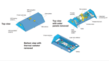 The GRACE-FO satellites obtain electricity from gallium arsenide solar cell array panels covering the outside of each satellite.[58]