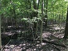 The Great Black Swamp (also known simply as the Black Swamp) was a glacially fed wetland in northwest Ohio, sections of lower Michigan, and extreme northeast Indiana, United States, that existed from the end of the Wisconsin glaciation until the late 19th century. Comprising extensive swamps and marshes, with some higher, drier ground interspersed, it occupied what was formerly the southwestern part of proglacial Lake Maumee, a holocene precursor to Lake Erie. The area was about 25 miles (40 km) wide (north to south) and 100 miles (160 km) long, covering an estimated 1,500 square miles (4,000 km2).[3] Gradually drained and settled in the second half of the 19th century, it is now highly productive farmland. However, this development has been detrimental to the ecosystem as a result of agricultural runoff.[4] This runoff, in turn, has contributed to frequent toxic algal blooms in Lake Erie.[5]