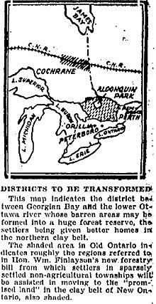 The Ontario government also passed legislation in 1927[5] to enable the migration of farmers from barren lands in older parts of the Province, such as Haliburton County, to areas such as the Lesser Clay Belt through the exchange of land.[6]