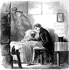 Pip is aware that Magwitch's fortune will go to the crown after his trial. But Herbert, who is preparing to move to Cairo, Egypt, to manage Clarriker's office there, offers Pip a position there. Pip always visits Magwitch in the prison hospital as he awaits trial, and on Magwitch's deathbed tells him that his daughter Estella is alive. After Herbert's departure for Cairo, Pip falls ill in his rooms, and faces arrest for debt. However, Joe nurses Pip back to health and pays off his debt. When Pip begins to recover, Joe slips away. Pip then returns to propose to Biddy, only to find that she has married Joe. Pip asks Joe's forgiveness, promises to repay him and leaves for Cairo. There he shares lodgings with Herbert and Clara, and eventually advances to become third in the company. Only then does Herbert learn that Pip paid for his position in the firm.[29]