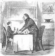 Dickens, whose health was not the best, felt "The planning from week to week was unimaginably difficult" but persevered.[40] He thought he had found "a good name", decided to use the first person "throughout", and thought the beginning was "excessively droll": "I have put a child and a good-natured foolish man, in relations that seem to me very funny."[42] Four weekly episodes were "ground off the wheel" in October 1860,[43] and apart from one reference to the "bondage" of his heavy task,[44] the months passed without the anguished cries that usually accompanied the writing of his novels.[40] He did not even use the Number Plans or Mems;[N 2] he had only a few notes on the characters' ages, the tide ranges for chapter 54, and the draft of an ending. In late December, Dickens wrote to Mary Boyle that "Great Expectations [is] a very great success and universally liked."[11]