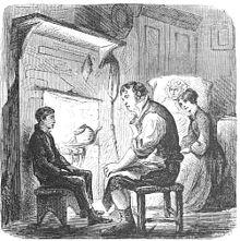 On Christmas Eve, around 1812,[15] Pip, an orphan about seven years old, is visiting the graves of his parents and siblings in the village churchyard, where he unexpectedly encounters an escaped prisoner. The convict scares Pip into stealing food and tools from Pip's hot-tempered elder sister and her amiable husband, Joe Gargery, a blacksmith, who have taken the orphan in. On early Christmas morning, Pip returns with a file, a pie, and brandy, though he fears being punished. During Christmas Dinner that evening, at the moment Pip's theft is about to be discovered, soldiers arrive and ask Joe to mend some shackles. Joe and Pip accompany them as they recapture the convict, who is fighting with another escaped convict. The first convict confesses to stealing food from the smithy, clearing Pip of suspicion.[16]