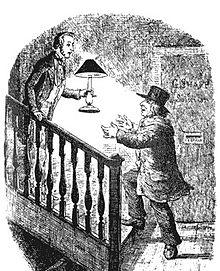 In his Book of Memoranda, begun in 1855, Dickens wrote names for possible characters: Magwitch, Provis, Clarriker, Compey, Pumblechook, Orlick, Gargery, Wopsle, Skiffins, some of which became familiar in Great Expectations. There is also a reference to a "knowing man", a possible sketch of Bentley Drummle.[33] Another evokes a house full of "Toadies and Humbugs", foreshadowing the visitors to Satis House in chapter 11.[33][34] Margaret Cardwell discovered the "premonition" of Great Expectations from a 25 September 1855 letter from Dickens to W. H. Wills, in which Dickens speaks of recycling an "odd idea" from the Christmas special "A House to Let" and "the pivot round which my next book shall revolve."[35][36] The "odd idea" concerns an individual who "retires to an old lonely house…resolved to shut out the world and hold no communion with it."[35]