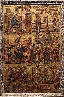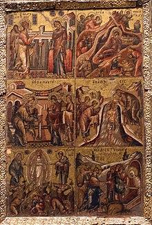 In Byzantine art a slightly different group were often depicted as a set, omitting the first three in the list above, and adding the Raising of Lazarus, Crucifixion of Jesus, and Harrowing of Hell.[3]