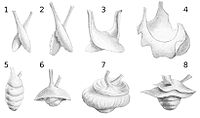 1- penises after protrusion from the body. 2 - commencement of the appearance of the frill. 3 - frill partially unrolled. 4 - frill completely expanded, preparatory to twisting together. 5 - penises tightly coiled together, forming the whorled knot. 6 - the succeeding umbrella form. 7 - umbrella form with horizontal margins reversed. 8 - umbrella form with double margins.