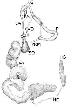 Reproductive system: The hermaphrodite gland (HG) is elongated and large, and is connected with spermoviduct (SO) by means of the hermaphrodite duct (HD) which takes its course through a portion of the albumen gland (AG). The spermoviduct is thick and well convoluted, and separates further down into a vas deferens or sperm-duct (VD) and an oviduct (OV). The former opens into the upper end of a very long penis (P), to which a strong retractor muscle (PRM) is attached. The lower portion of the penis unites with that of the oviduct at the genital orifice, so that there is no vestibule. The receptaculum seminis (RS) opens into the lower end of the penis near the junction of the two ducts.[7]