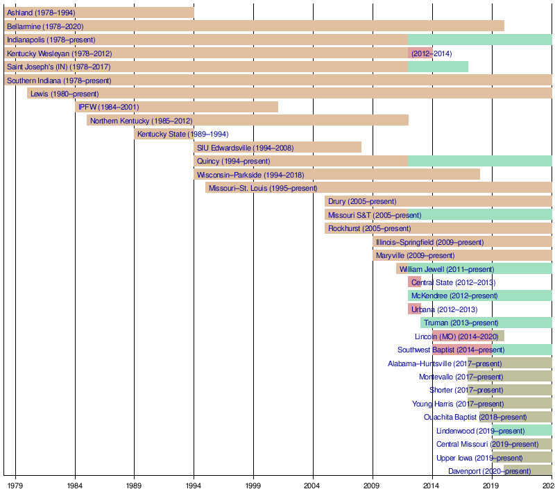 In 2014, two Missouri schools, Lincoln University and Southwest Baptist University, joined the GLVC in football while otherwise remaining MIAA members.[7]